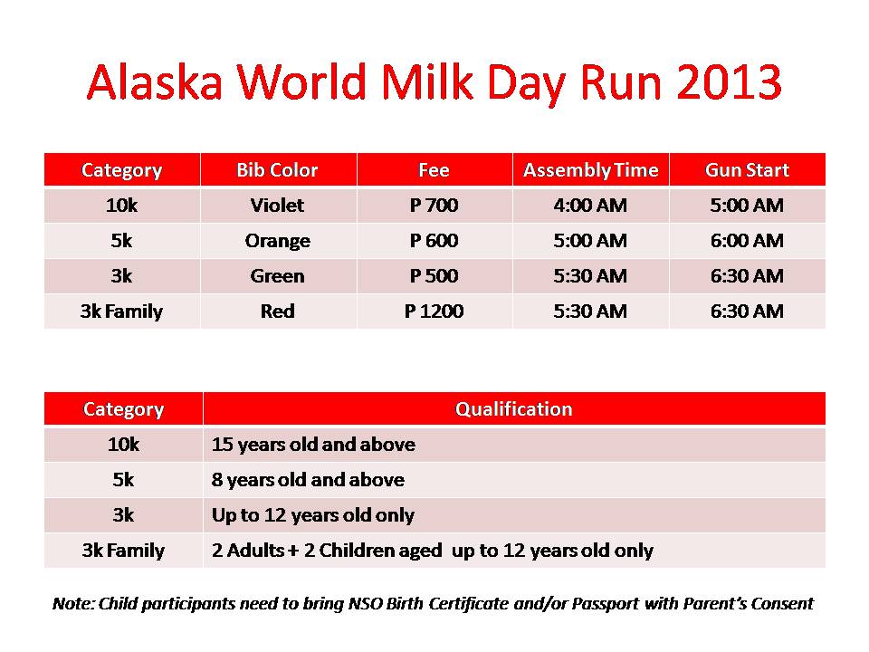 Alaska will celebrate World Milk Day with a fun run on Jun 9, 2013 at the Bonifacio Global City, Taguig City. Race categories are 10k, 5k, 3k, and 3k Family. Registration is ongoing at Glorietta 3 infront of Zara. Online registration is also available via www.alaskaworldmilkday.com/2013